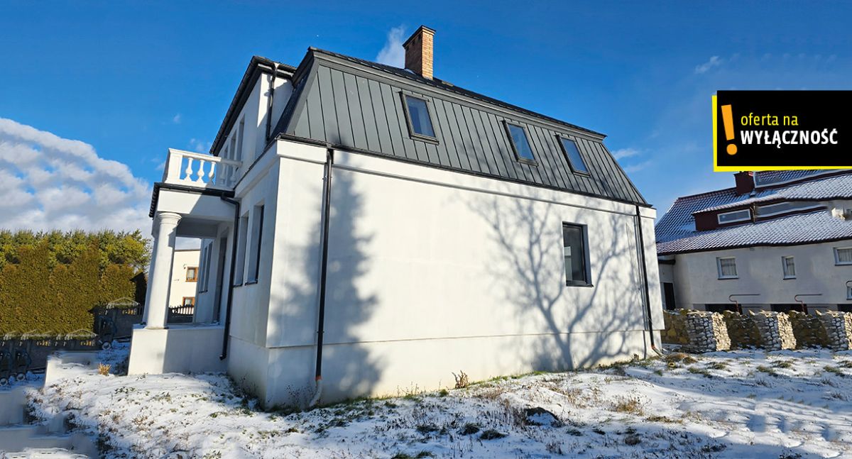 Wiejskiej.Architektura domu inspirowana stylem dworkowym, z reprezentacyjnymi kolumnami od strony ogrodu oraz nowoczesnym układem pomieszczeń i dachem z blachy na rąbek stojący (grafit). Dom częściowo podpiwniczony, jest sprzedawany w stanie do wykończenia, choć znaczna część pracochłonnych prac została już wykonana, co pozwala szybko doprowadzić nieruchomość do zamieszkania.
